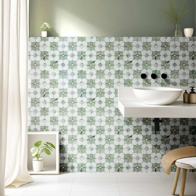 Carrara white green petal shaped natural marble Mosaic with metal trim is a simple villa kitchen and bathroom background wall and floor Mosaic tile